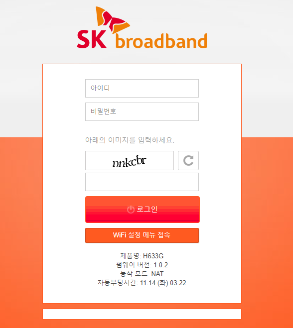 우리집 공유기는 sk 브로드밴드를 사용하고 있다. 포트포워딩을 위해 기본 게이트 웨이 ip를 이용해 브라우저에서 접속하면 이런 창이 나온다.