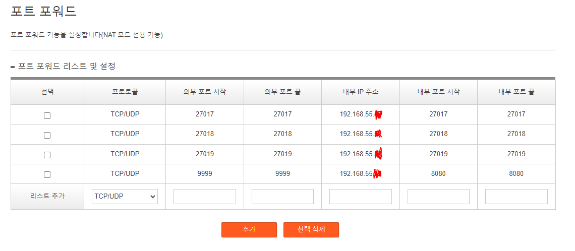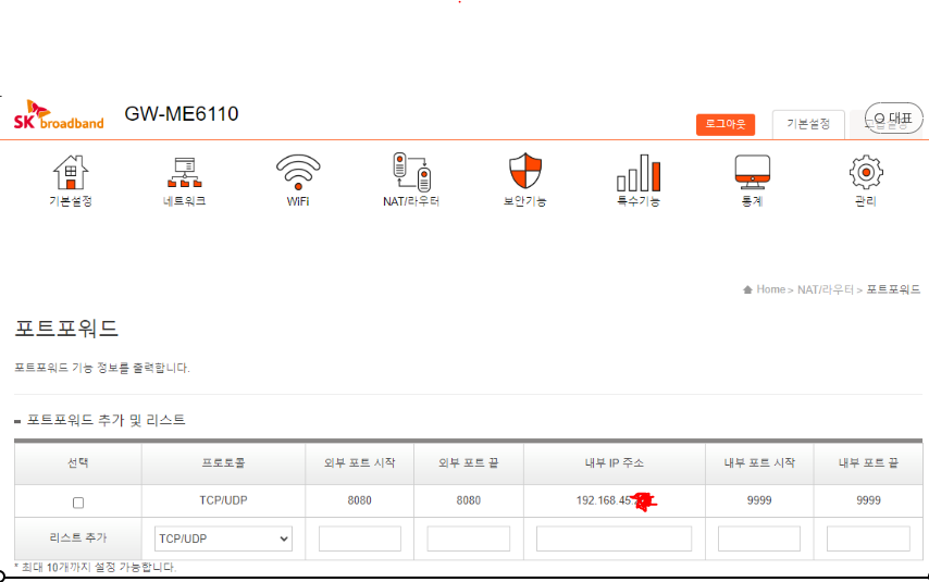 외부 ip를 브라우저 url입력창에 입력해 들어가면 나오는 공유기 관리창에서, 포트포워딩을 한 번 더 한다. 외부포트는 8080을 열 것이고, 8080으로 들어오는 신호는 내부 공유기 ip의 9999번 포트에 보낸다는 걸 의미한다.