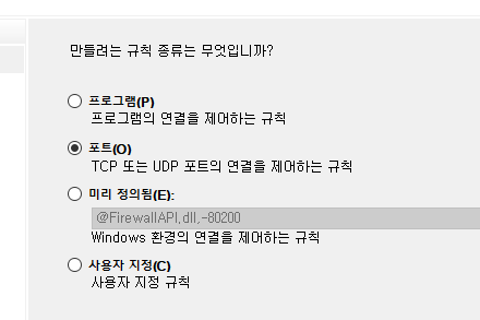 우리가 원하는 건 특정 포트를 외부에서 접속할 수 있도록 개방하는 것이니 포트를 고른다.
