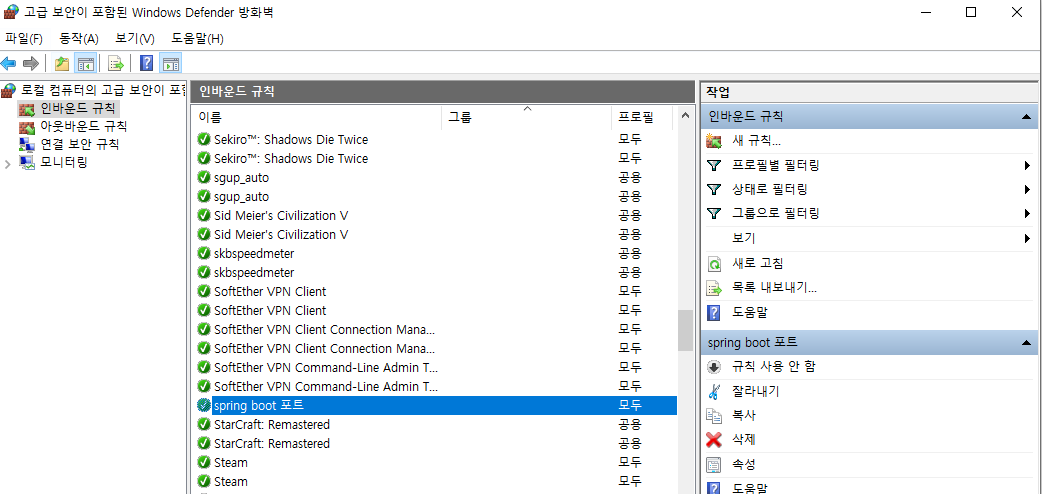 고급 설정에서 인바운드 규칙 -> 새 규칙을 통해 새로운 규칙을 생성한다.