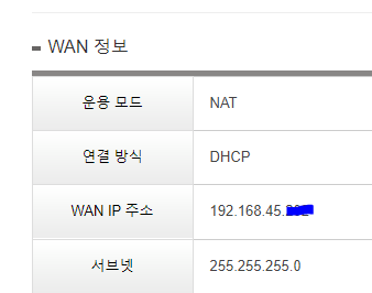내 컴퓨터와 연결된 공유기 관리 페이지에서 네트워크 상세 정보 창에 들어간 모습이다. 1.xx로 시작하지 않고, 192.168.xx로 시작하는 것을 볼 수 있다. 외부 ip와 완전히 다른 구조로 되어 있는데, 이 부분에서 의구심을 가지게 되었다.