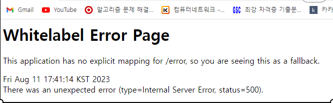 그러자 성공적으로 http response를 받는 것을 볼 수 있다. 오류 페이지는 내가 서버에 작성을 완전히 끝내지 않아 뜨는 것이다. 결국 외부에서 내 컴퓨터의 서버 애플리케이션에 접속하는데 성공했다.