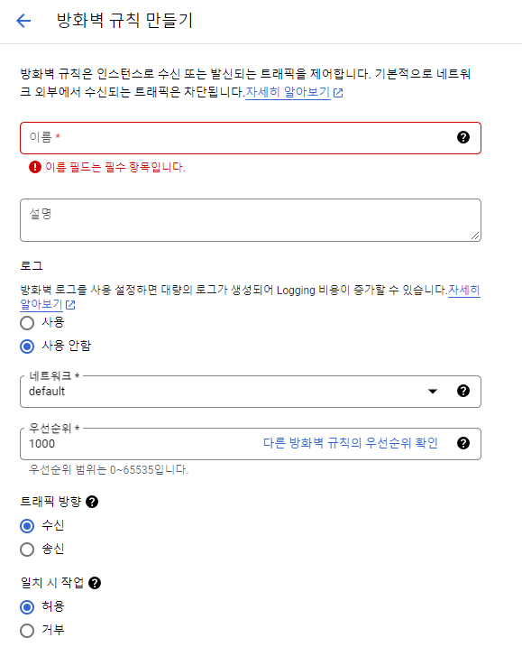이름은 필수이다. 트래픽 방향 수신, 일치시 허용 작업으로 지정한다.