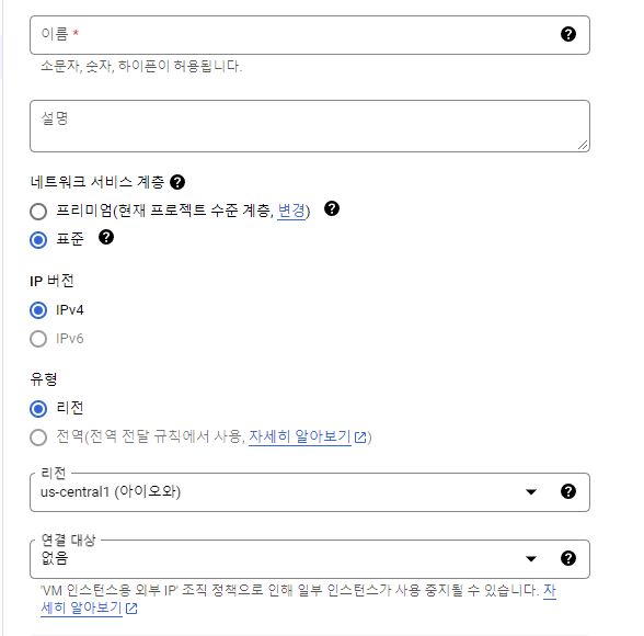 이름과 계층, ip 버전을 선택하고 리전을 골라준다. 리전은 아마 위치가 한정되어 있을 것이다. 인스턴스 생성한 그 리전과 비슷하게 맞춰줬다. 연결 대상을 우리가 만든 인스턴스로 지정한다.
