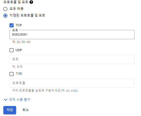 그 다음 이런식으로 tcp 포트를 열어주도록 한다. 나는 8080과 8081을 열어줬는데, 8081도 나중에 사용할 일이 있을 것으로 예상되어 그렇게 설정했다. 다 끝나고 저장을 누르면 된다.