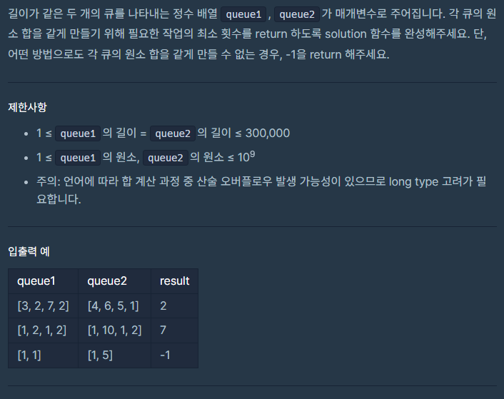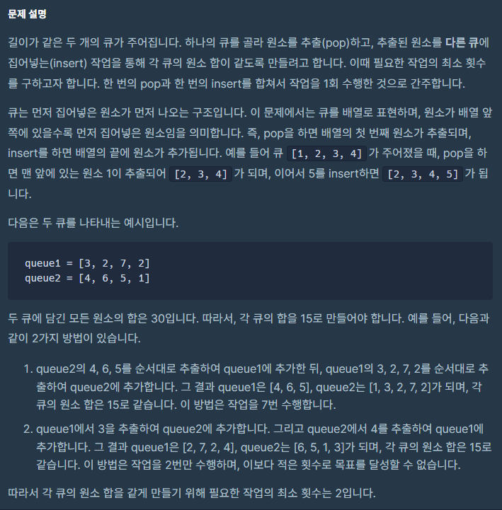 sum1, sum2는 각 각 queue1, queue2에 들어있는 수들의 합이 되겠다. sum1과 sum2를 계속 비교하면서, 큰 쪽이 작은 쪽의 큐에게 수를 넘겨주는 것이 최적의 해가 될 것이라 생각하고 구현했다.