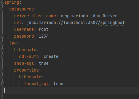 datasource부분을 통해 어느 데이터베이스를 선택할 지 정한다. 선택한 뒤 그 데이터베이스에 접근할 때 사용하는 계정이름, 비밀번호를 등록한다. 밑에 hibernate 의 ddl-auto 옵션을 통해 데이터베이스에 자동으로 무엇을 하게 할 지 지정할 수 있다. ddl은 Data Definition Language의 약자로, 데이터 정의어를 의미한다. create, alter, drop, truncate 등을 떠올릴 수 있다. 즉 이 ddl을 애플리케이션 실행 시 JPA 설정을 하면서 자동으로 실행하도록 정하는 것이다.