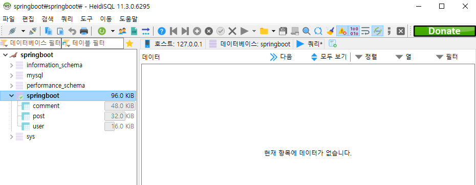 접속을 한 후 모습이다. 각 테이블은 내가 만든 entity들이다.