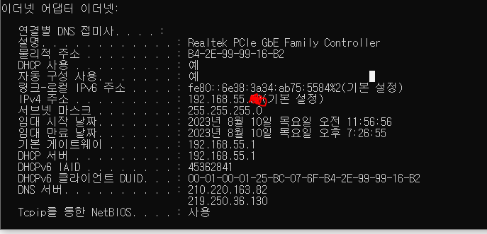 프로젝트를 진행하던 중, 프론트 팀원으로부터 한 번 열린 서버를 통해 테스트해보려 한다는 이야기를 듣고 외부에서 접속을 위한 준비를 했다. 포트포워딩을 하는 과정과, 그 과정에서 발생한 이슈들을 이야기 하려한다. 내 로컬 컴퓨터에서 실행되는 애플리케이션 서버에 접속하기 위해서는 당연히 내 컴퓨터의 주소를 알아야 할 것이고, 주소를 알고 pc로 찾아왔다면 그 다음에는 spring이 실행 중인 애플리케이션 포트 위치를 알아야 할 것이다. 먼저 아이피 확인을 위해 cmd창을 켜 ipconfig/all을 입력했다. ipv4 부분을 내 컴퓨터가 할당받은 내부 ip로, 이를 이용해 포트포워딩을 진행하려 한다. 우리집 공유기는 sk 브로드밴드를 사용하고 있다. 포트포워딩을 위해 기본 게이트 웨이 ip를 이용해 브라우..