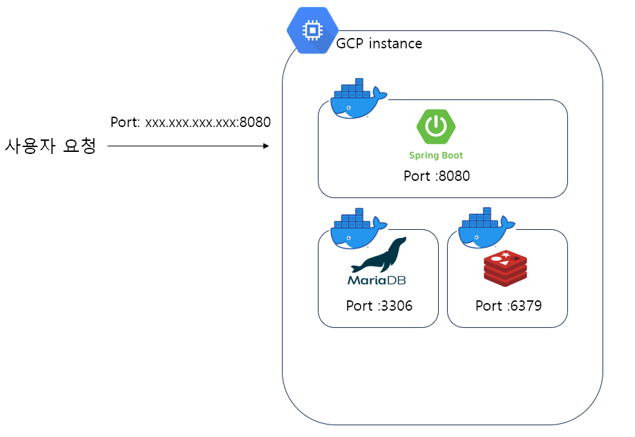 프로젝트 작성이 거진 다 끝나고, 테스트와 기능 개선 과제, 그리고 배포 정도의 과제가 남았다. 이제 로컬로 개발서버를 여는 것 뿐 아니라 클라우드 인스턴스에 24시간 배포를 시작해보려 한다. 클라우드 서비스는 가장 대중적인 아마존의 AWS, 마이크로소프트의 Azure, 구글의 GCP 등등 여러가지가 존재하는데, 나는 여기서 GCP를 선택했다. 이유는 단순하게도 무료로 이용이 가능해서(...) 이다. 다른 서비스는 무료를 더 이상 쓸 수 없는 상황.. 당장 복잡한 클라우드 아키텍처를 설계하지는 않았다. 일단 가볍게 다음과 같은 구조를 생각했다. GCP인스턴스 하나를 실행해서 그 안에 도커를 이용해 3개의 컨테이너를 띄운다. 8080으로 요청을 보내면 설정을 통해 스프링 부트 애플리케이션이 실행중인 컨테이..